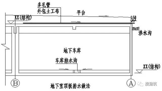 ● 车库应设计洒水栓及排水沟;车库等地下室顶板如有覆土,除在覆土面上应设计地面排水之外,也应设计覆土内渗水的排水。
