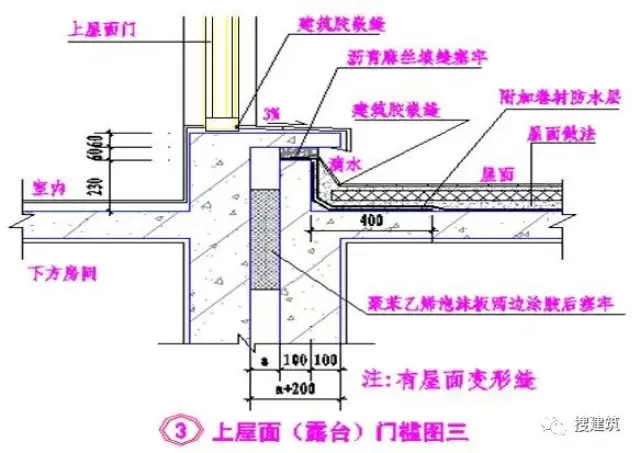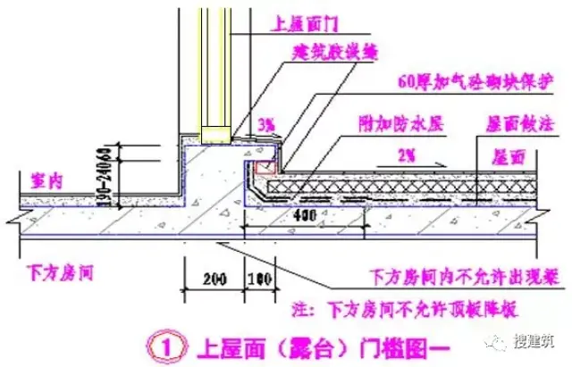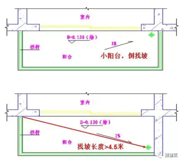 ● 如露台不降板,应在门口处做反槛,反槛高度应尽量小,最大宜为结构至结构250~300,即门槛比门口处的室外完成面高80~100,比室内楼面高200~250,当不能满足时,应调整排水方案(图)。