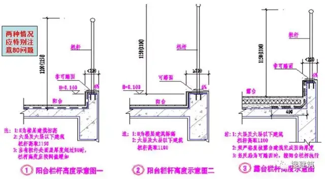 ● 有保温层的露台栏杆栏板,应严格复核找坡层及面层的厚度,保证栏杆栏板净高:高层及中高层≥1150,多层及低层≥1100。