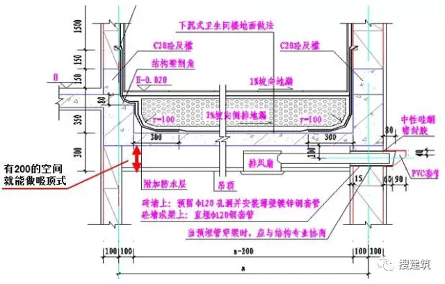 ● 普通住宅卫生间应做大降板,最底层住宅下方为架空层等公共开放空间时,可不做大降板。
