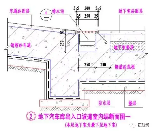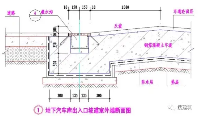 ● 地下一层有开口露天段的汽车坡道,靠地面端应设截水沟及100MM高反坡,另一端应设排水沟。截水沟及排水沟所用金属蓖子必须能承受汽车荷载(图)。