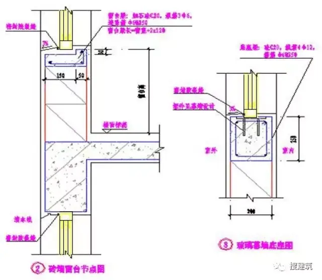 ● 砖墙窗台应做钢筋砼窗下口梁 ,玻璃幕墙落在屋面或砖墙上时,应做钢筋混凝土底座(图)。