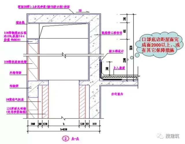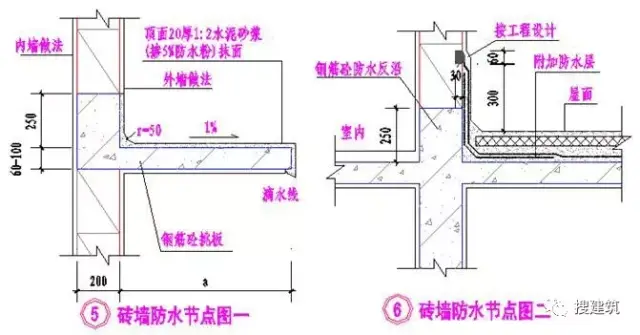 ● 砖砌外墙上设有非空调位挑板时(如雨篷、遮阳板及装饰构件等),挑板根部应做250高砼防水反槛(图)。