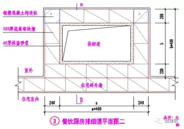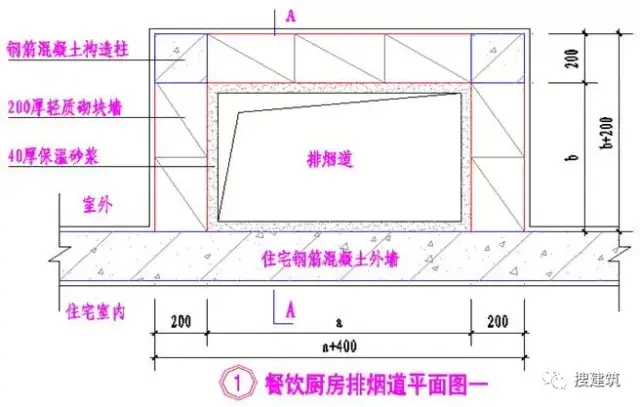 住宅须设成品烟道 ,当别墅建筑竖直烟道对上层有影响 时,不设烟道的厨房,应在厨房外墙上预留φ150孔洞并安装薄壁镀锌钢套管,留洞处为钢筋砼梁或墙时,应直埋φ150钢套管,留洞或套管高度应考虑排烟管在厨房吊。