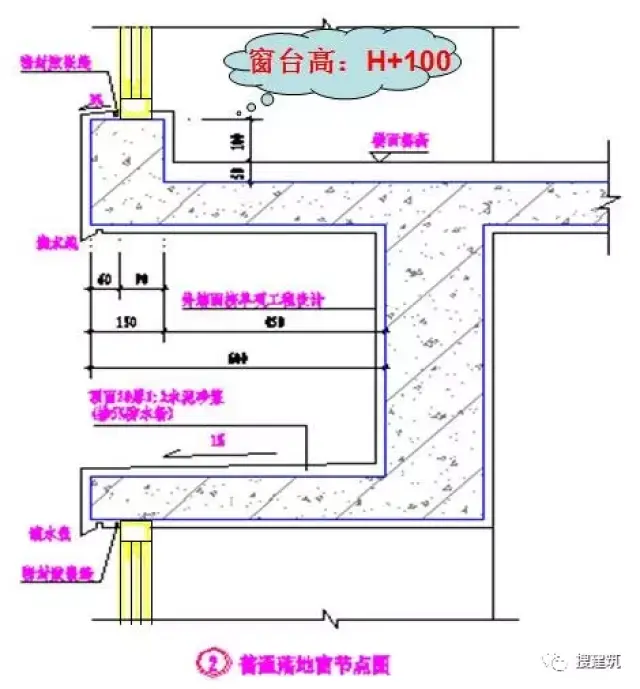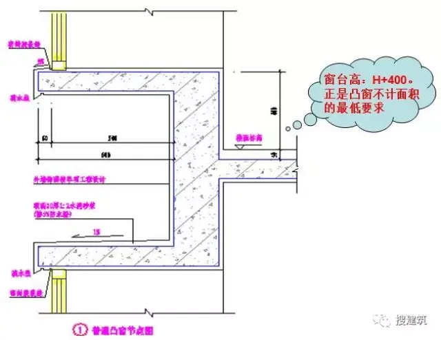 ● 凸窗窗台高一般取400,凸窗台板外缘凸出外墙面600。落地窗根部应做结构上反150高反槛。