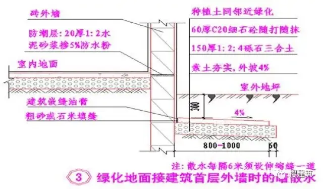 散水设置:当硬化地面接建筑外墙时,硬化地面兼做散水;当绿化地面接建筑外墙时,应做暗散水,即散水面下沉300,上置绿化土(图)。