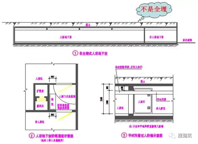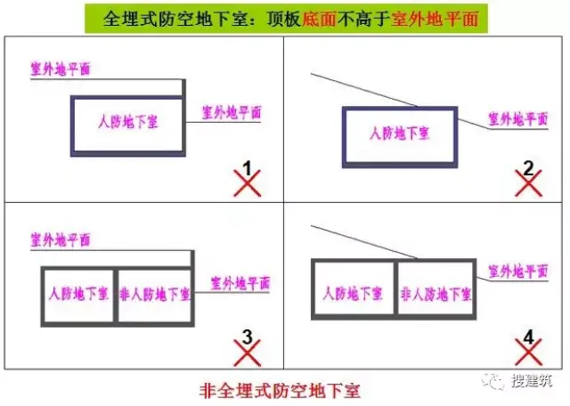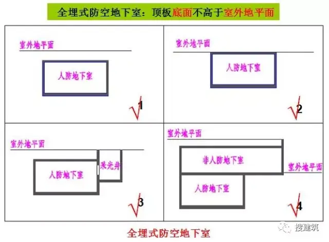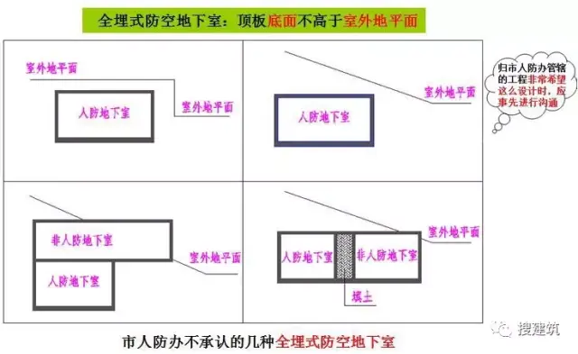 ● 人防地下室应全埋。注意:当与人防地下室相连的非人防区地下室露出地面时,则认为人防地下室不满足全埋要求(图)。