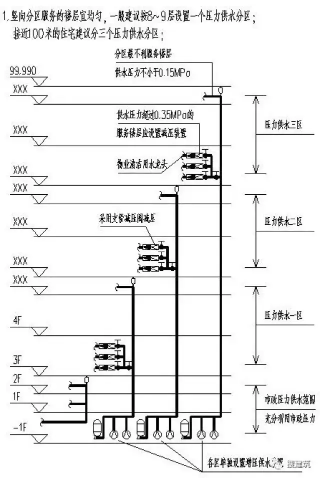 ● 给水各分区最不利楼层所需供水压力按0.15MPa计算;供水压力大于0.35MPa的楼层,应设减压装置减压后供水。