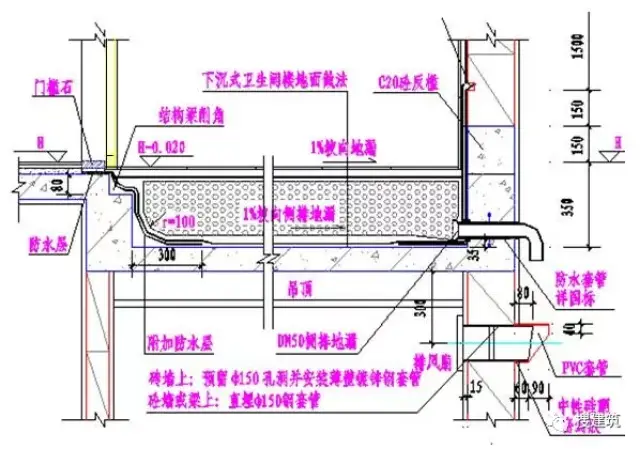● 卫生间应做排气扇,排气扇宜为吸顶式,梁上(在吊顶范围内)预埋φ120钢套管。当住宅层高小于3000且卫生间为大降板时,吊顶内高度不足,可在吊顶下墙上安装排风扇,墙上预留φ150孔洞并安装薄壁镀锌钢套管,留洞处为钢筋砼梁或墙时,应直埋φ150钢套管(图)。
