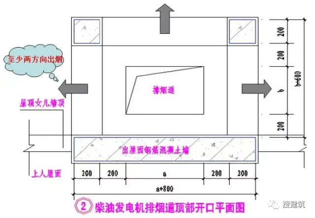 ●柴油发电机的排烟处理,应按当地政府部门规定执行。低空排放时应避免排烟口高温气体伤人及对邻近住户的影响。高空排放时排烟道的高温及油渍不应对相邻住户产生影响(图)。