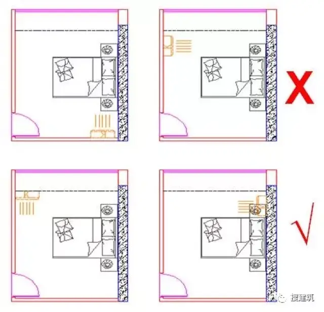 ● 有上下水的洁具及立管应考虑噪音对卧室的影响(如马桶),尽量避开卧室墙面布置。