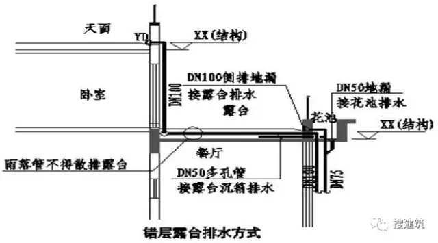 ● 本户上层的屋面雨落管或阳台、露台、空调等排水管,不得散排到本户阳台、露台,应采用管道排至下层。