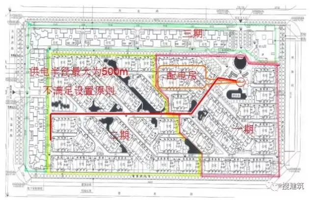 ● 配电房选址时,除按规范规定应考虑的各种因素外,还应考虑:当项目用地有明确的“居住”及“公共”等不同性质的用地时,在项目设计中应避免将居住建筑的设备用房,布置在“非居住用地上”。