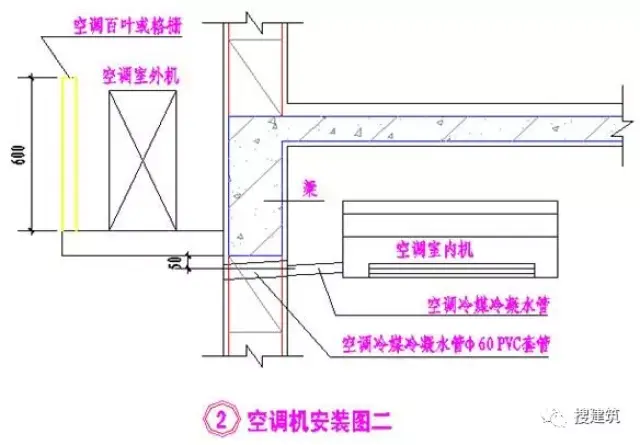 ● 空调冷媒冷凝管穿外墙时,外墙预埋φ60PVC套管(穿梁及砼墙时,改为φ60钢套管)。当室内机为壁挂机时,套管中心设在梁下50处。若需穿梁设置时,套管中心距楼层板底面不应小于350。当室内机为柜机时,套管中心距楼地面建筑完成面200,均向外倾斜5度。需详细标明套管平面及高度位置(图)。
