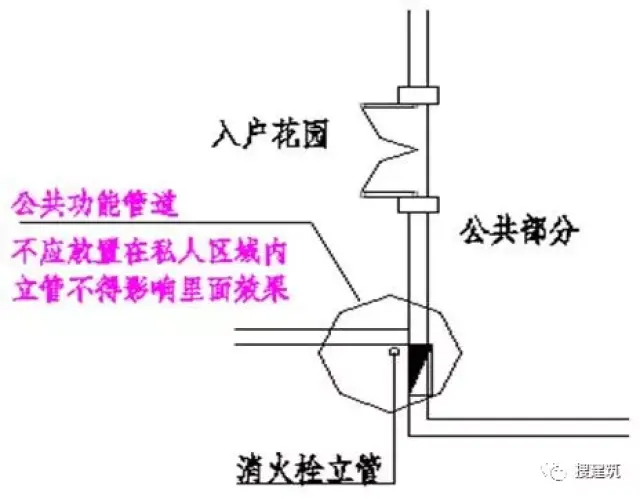 ● 当住宅外立面要求较高时,应将立管敷设在隐蔽位置或管井中。