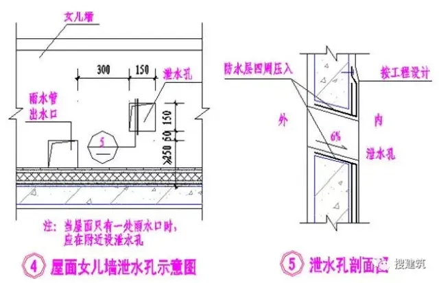 当独立小屋面仅设有一处雨水口时,在雨水口旁边应设150×150的泄水孔(图)。