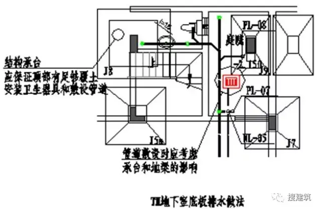 ● 地下室底板下敷设的管道(重力排水),管径宜放大一号,以减少堵塞的可能;排水管布置应避开承台及地梁。
