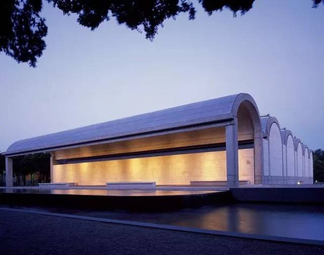 筒壳与端部的隔墙留有一道从上到下渐宽的空隙,清晰地显露了屋顶的结构特征,还引入了额外的自然光线。金贝尔美术馆是康对光的献礼,它简单素朴却又华丽高雅,阳光穿过混凝土结构,在空间中弥漫,暗淡的混凝土在光底下活了起来,参观者和绘画在结构和自然光的笼罩中交会。这座建筑主要使用了:2.纪念性,3.对历史和文脉的回应,14.光,这三种结构表现策略。