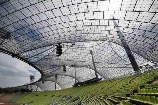 除了重量和刚度方面的差别,较晚出现的透明膜材有着与玻璃类似的效果。但轻型的膜结构使其所能达到的视觉透明性与结构清晰性更胜一筹。早期的著名实例是由建筑师冈特·贝尼施(Günter Behnisch)与弗莱·奥托设计的慕尼黑奥运会主体育场屋顶(Roof for Olympic Stadium,1972)(图51)。