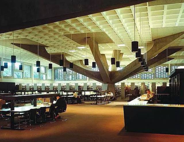 马绍尔·布劳耶(Marcel Breuer)与奈尔维设计的明尼苏达圣约翰大学(St.John's University in Collegeville)奥奎恩图书馆(Alcuin Library,1964),使用了十分粗犷的钢筋混凝土V形支撑(图5)。
