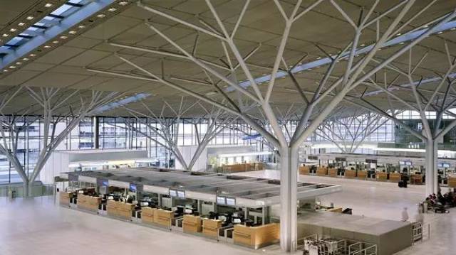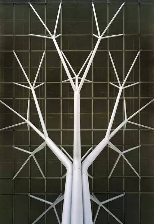 GMP建筑事务所与施莱希&贝格曼事务所(Schlaich Bergermann)合作设计的施图加特机场3号航站楼(Stuttgart Airport Terminal 1,1991),屋顶以18簇独特的树形结构(dendritic structure)为竖向支撑,将荷载从48个井格梁节点按48-12-4-1的方式分四级汇聚,经由逐级变粗的管状分支构件向下传递至基础(图43、图44)。其结构在避免弯曲应力的同时实现了大跨度,效率很高而又富于表现力,成为这个航空建筑独有的特点。