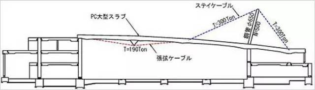 日本建筑师池原义郎(YoshiroIkehara)与结构学教授斋藤公男(Masao Saitoh)合作完成下关唐戸市場(Karato fishery Market,2001)(图12),其屋面一方面由于荷载大而需要较大的厚度,另一方面又不能影响屋上花园向远处观瞻的效果,梁高必须尽可能的小。同时根据结构对盐害的耐久性以及屋顶花园的功能性要求,决定采用由预制混凝土板-钢索张弦梁和斜拉索组成的复合结构,形成了一个跨度44.8m的巨大无柱空间,2.57m高的张弦梁宛如连接在屋面的吊索一样,给人以悬吊结构的印象。设计者“想将‘力的传递’以及‘通常看不见的材料’视觉化。所以在此结构中,尽可能利用预制板的形状把预制的张紧索材作为张弦梁的弦暴露出来(图13),使预制混凝土的强壮(重量感、高耐久性的视觉效果)与弦材、索材的纤细形成鲜明的对比。通过立体的屋面板以及张紧的拉索,给人以紧张感,可以体现出在此劳动的人们的心情”。