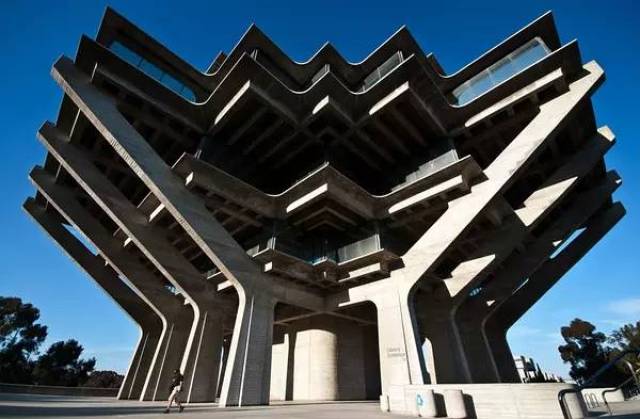 美国建筑师威廉·佩雷拉(William Pereira)设计的加州大学圣地亚哥分校(UCSD)盖泽尔图书馆(Geisel Library,1970),为了减少结构构件所占的空间,增加图书馆的室内面积和通透性,并降低造价和维护费用,使用了置于外部的预应力混凝土结构,也造就了其独特的外形与粗野的结构表现。