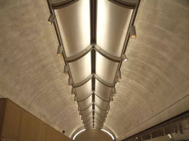 结构体系通过各单元之间的间隙、与隔墙的脱离以及外墙立面提示出来,这种表达一直延续到室内,形成了一连串的由结构和光共同界定的空间。展览空间中除了日光之外没有别的光源,光从每个筒壳的顶部进入一条通长的狭缝,一部分通过穿孔的铝制扩散器进入室内,剩下的一部分被反射为银色,并沿着抛光的清水混凝土顶面倾泻而下(图57)。