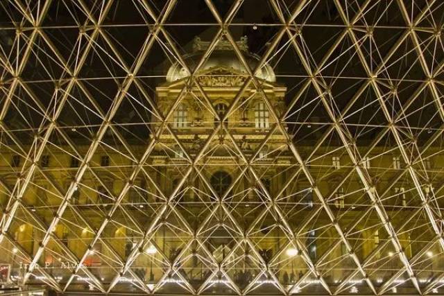 对光线与透明感的处理是让·努维尔(JeanNouvel)的作品中不断涌现的主题。在阿拉伯世界研究中心(Institut du Monde Arabe,1987),狭窄的西立面上使用了水平的弗伦第尔桁架,使视线在转角处得到通透,弯曲的外弦提供了一种半透明的柔和感。南立面则以格构式大梁——而非实心箱型梁或I形钢梁——为支撑,杆件的通透性与复杂性进一步衬托出了外表面玻璃幕墙的透明性与华丽感。精致的组合结构构件与追求的建筑效果在此保持了高度的一致。贝聿铭(Ieoh Ming Pei)与结构工程师罗格·尼科莱(Roger Nicolet)等设计的卢浮宫玻璃金字塔(Pyramide du Louvre,1989),其复杂的结构体系使用了6 000根杆件和超过21 000个节点。尽管从一些角度上观察,数量庞大的杆件和节点显得比较零乱,但因为其采用了高透明度的玻璃和精巧的不锈钢构件,所以在为博物馆的地下空间提供宝贵光线的同时,还以最小限度的体量感和最大限度的透明性表现了对卢浮宫历史建筑的高度尊重(图49)。