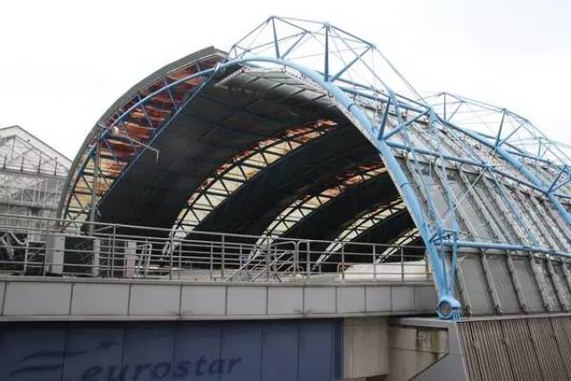 (Waterloo International railway station,1993),其令人印象深刻的屋架由37榀三铰索桁架拱并列而成,中间的铰点偏于一侧,非对称的跨度为室内高架铁轨的铺设提供了可能,两段索桁架拱分正反两向安置,以形成内外张力空间的对比,受压和受拉构件都是弯曲的,这种被称为“香蕉形”的结构形态与弯矩图相互对应,彼此诠释着对方,无论在室内还是室外,结构形式都一目了然