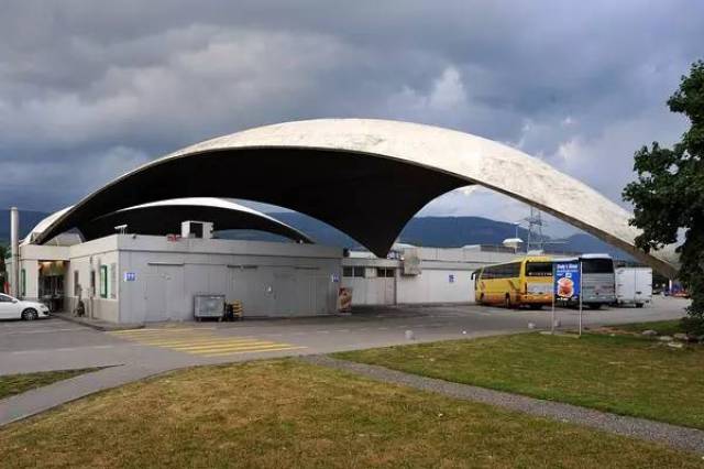 对于那些结构艺术家而言,轻巧的结构更是他们一贯及共同的追求。德国建筑工程师弗莱·奥托(Frei Otto)设计的张拉结构构造简单、重量轻且形式优美,开敞的空间与周围环境流线过渡,能呈现出几乎漂浮的状态,参观者身在其中却没有任何束缚感,一直被认为是完美建筑技术的标志。瑞士建筑工程师海恩茨?伊斯勒(Heinz Isler)建造的混凝土壳体纤薄而优雅,它们采用反曲率的办法保持稳定,边缘没有边梁,呈现出如纸或布一般的轻盈感,仿佛能够在完全自然的状态中漂浮一样。例如戴廷根高速公路服务站(Deitingen Service Station,1968)。