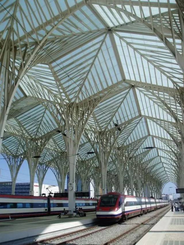 卡拉特拉瓦在早期的多伦多艾伦·兰伯特广场(AllenLambert Galleria,1992)中已开始使用“树”作为结构表现的意象。里斯本东方车站(Oriente Station,1998)站台钢结构顶棚的构件截面都是I形,具有哥特风味的白色主拱肋向顶端逐渐弯曲并变细,圆滑的肋拱加腋节点与锐缘而纤薄的截面使人联想起棕榈叶,整个顶棚远远望去宛如一片棕榈树林,在厚重的混凝土拱形结构底座的映衬下,显得轻巧而异常精美(图39)。