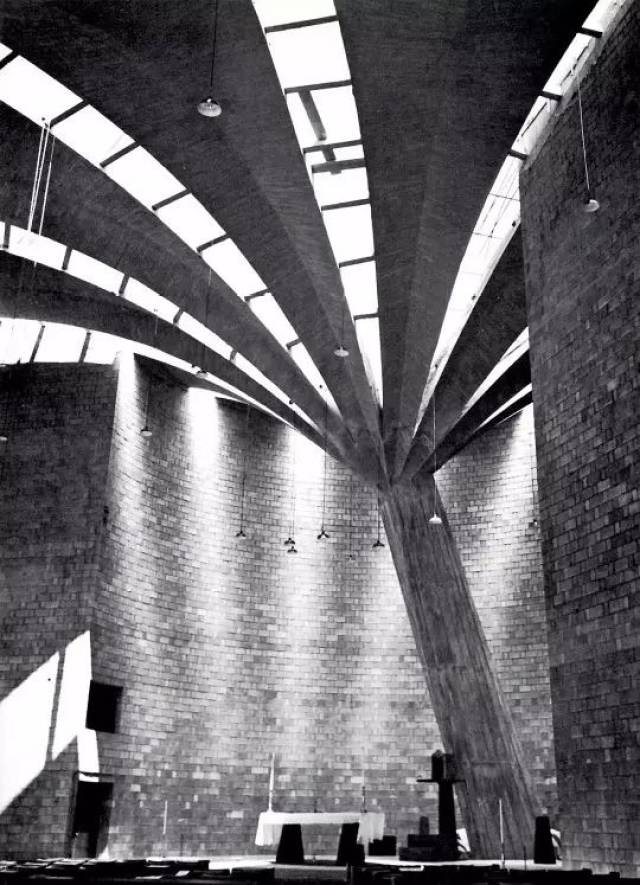 在结构艺术家的作品中,结构与建筑一体化的曲面更是为光线的入射及反射提供了无穷无尽的变化。在坎德拉设计的圣莫妮卡教堂(Capilla de Saint Monica,1955),12片弯曲薄壳将屋顶的重量全部汇聚于祭坛后部一根倾斜的圆柱上,光线从薄壳之间的狭缝中均匀洒落,使整个教堂笼罩在一片宁静祥和的氛围中(图53)。