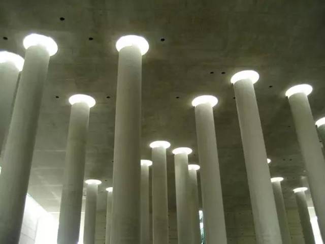 在德国舒尔茨建筑事务所(AxelSchultes Architects)设计的柏林鲍姆舒伦维格火葬场(KrematoriumBerlin-Baumschulenweg,1999),29根巨大而光滑的混凝土圆柱零散地分布在吊唁大厅中,仿佛飘荡着的亡魂,光线出人意料从柱头与屋顶交汇处的环形空洞中进入。在这里,通常的荷载传递方式被改变,结构的尺度也必然不是出自力学上的必须,而是为了调节氛围,这使得整个空间呈现出一种深沉的纪念性(图37)。