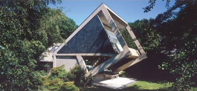 法国艺术家、建筑师克劳德·帕朗(ClaudeParent)在杜什别墅(Villa Drusch,1963)中,将钢筋混凝土的结构框架与地面呈45°角倾斜(图17),并在其中安置了一个玻璃盒子作为起居空间,活泼的形态充分体现了他的“斜建筑理论”(theory of oblique architecture)。