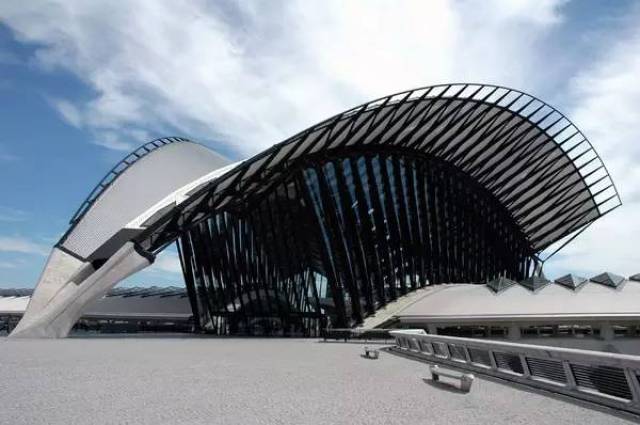 图书馆屋顶则由4个各边不等高的双曲面混凝土壳向中心汇集于一点,支撑在一根梭形钢柱上,覆盖着一个两层高的空间,自然光沿着边缘的缝隙洒入,卡拉特拉瓦将这个屋顶想象为一本翻开的软皮书,或者飞鸟伸展的双翼。在圣?埃克苏佩里火车站大厅(Gare de Saint-Exupéry,1994),一个脊柱般的的钢拱桁架跨越了整个建筑,拱推力通过拟兽形的扶壁传给基础,屋顶强劲的两翼从拱架中悬挑出来,又仿佛鸟或蝴蝶在飞翔(图41)。