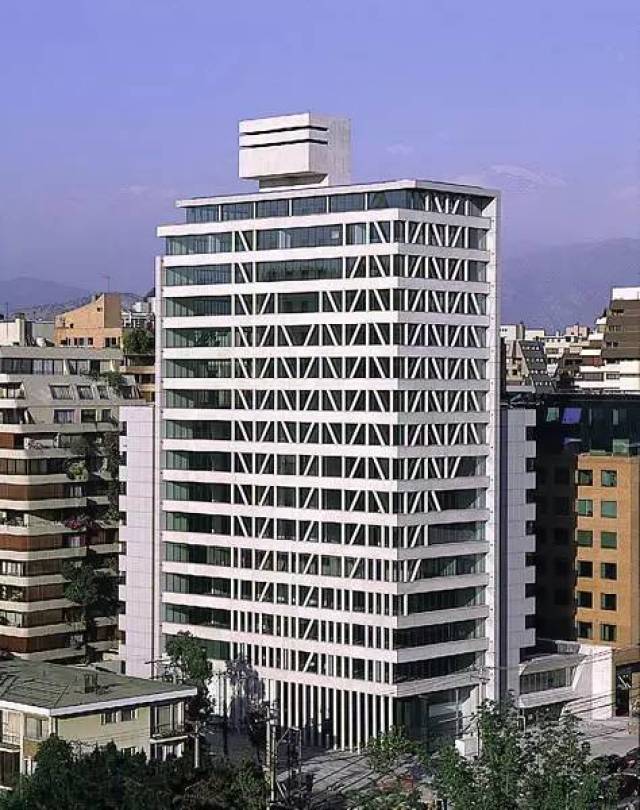 在大多数建筑师眼中,形式是第一位的,结构的力学逻辑虽然得到表现,但它们都服从于形式,隐藏于形式之中。IzquierdoLehmann Arquitectos建筑事务所设计的泉水大厦(Edificio Manantiales,1999)采用了不对称的平面布置,使用的是钢筋混凝土框架梁柱+偏置核心筒结构,为了抵抗地震运动引起的扭转变形,又要避免使用粗大笨重的抗震结构,于是引入了一个渐变的外框柱+斜撑体系,将反映了应力集中程度的结构构件转化为活泼的外立面装饰构件。