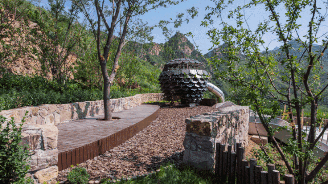 挡墙和木桩都采用了山里就近的材料。游乐设施也使用原木系映衬自然的调性。