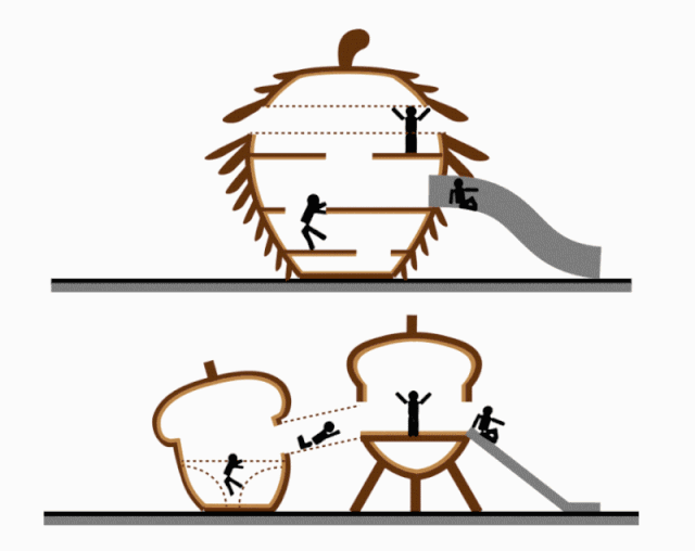 对孩子们来说,场地是否“有趣”总是最关键的,而这种“有趣”往往可以通过确立某个鲜明主题来实现。夸张的造型、奇怪的设施,那些他们平常体验不到的玩耍感受,常常会让儿童兴奋异常、记忆犹新。