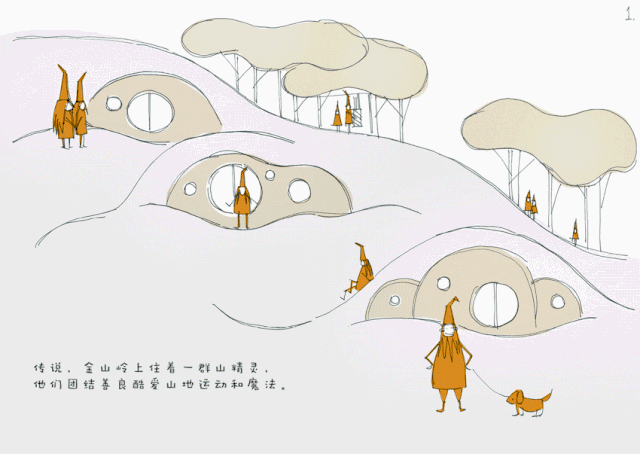 30°的缓缓山坡上座落着许多的精灵屋,那是山精灵居住的精灵村。有和妈妈一起听山精灵松塔绘本的大屋,有属于孩子尺度的秘密小屋,精灵羊生活的羊屋,精灵兔生活的兔屋。不同尺度的屋子有不同空间感受,孩子们可以感知尺度和与动物互动。