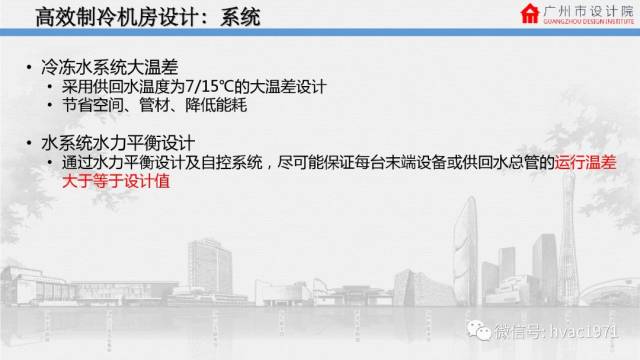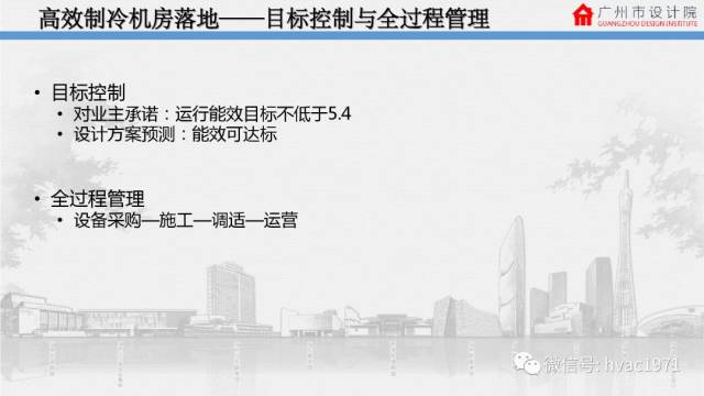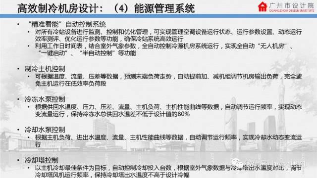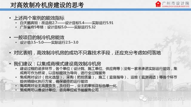 广州白天鹅宾馆、广东省政府5号楼,介绍了项目概况、节能措施和效果。他们指出,高效制冷机房的成功不只靠技术手段,还应充分考虑如何落地。建议:以集成商模式建设高效制冷机房,在建设过程的诸多环节,各个单位(设计院、施工单位、供应商等)没有一家来承诺实际运行能效,集成商可作为桥梁,以目标能效为导向,进行全过程服务;集成商对设计(优化选型)、采购(把控质量)、施工(监督指导)、运维(监测调适)等各个环节提供精细化执行方案,确保最终的运行能效;集成商对业主高度负责,责任归一,业主的审核目标也单一化;集成商可以是设计单位、咨询单位或节能服务公司。