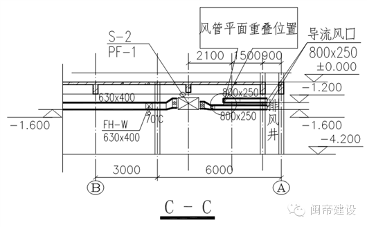 图5.16就是前文以暖施-04图局部为例(图5.14)时提到的C-C剖面,我们可以看见在风管重叠处风管上下布置,在竖向上错开,这也是这个剖面图强调表示的内容。