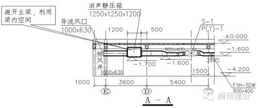 图5.17是暖施-04中的A-A剖面,在这里应该强调一下,它主要表现了车库排风兼排烟系统P(Y)-1由风机排入排风井之间管道的竖向关系,由图中可以看到消声静压箱高度较高,因此其位置错开结构主梁位置,利用了部分梁内空间安装。表达管道设备与结构梁、板的相对关系是剖面图在图面表达上的特点