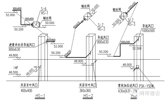 在竖风道图中可以明了地看出各加压送风系统的送风口标高、尺寸,出于完整表达系统的需要,还将加压送风机的安装标高、送风管管径及安装标高等绘制在图纸上,将竖风道图与相应的风管平面图对照观看可以迅速了解整个系统的基本情况。