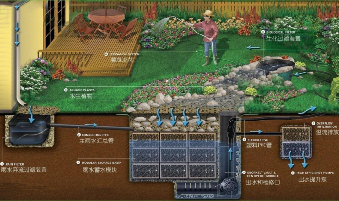 雨水收集系统可分五大环节,即通过雨水收集管道收集雨水-弃流截污PP雨水收集池储存雨水-过消毒-净化回用,收集到的雨水用于浇溉植物、补充地下水、还可用于景观环境、绿化、洗车场用水、道路冲洗冷却水补充、冲则等非生活用水用途。可以节约水资源,大大缓解我国的缺水问题,同时,雨水收集系统也是建设海绵城市的重要措施之一。