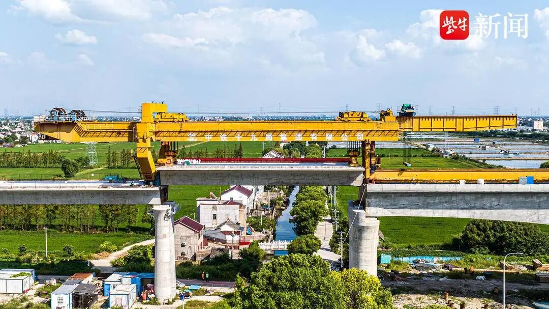 沪苏湖高铁起自上海虹桥站,途经苏州吴江,终至湖州市湖州站,路线全长约163.8公里,设计速度为每小时350公里。其中,江苏段约52.2公里,设苏州南站、盛泽站2个车站。项目于2020年6月开工建设,目前江苏段箱梁架设全部完成,正推进无砟轨道施工,预计2024年建成通车。