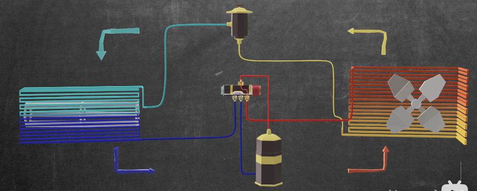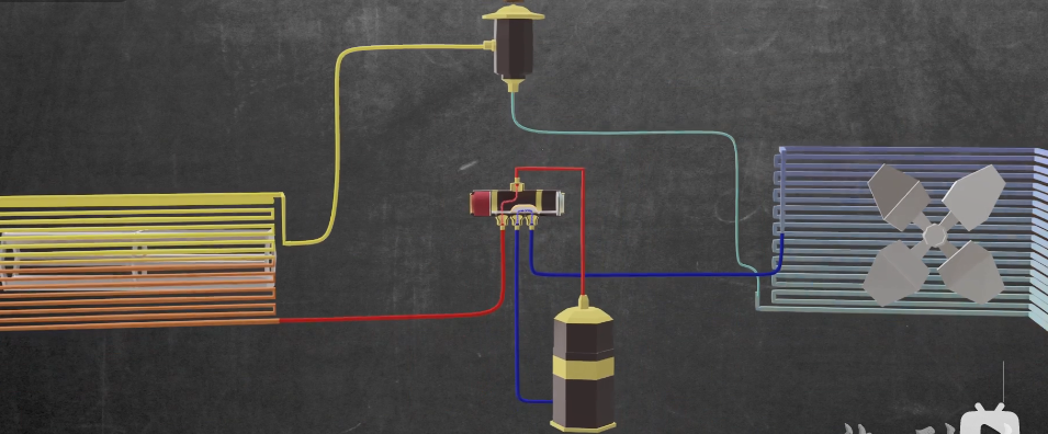 四管制多功能风冷热泵机组集冷热源于一体,是由压缩机、冷凝器、蒸发器、可变功能换热器等组成,采用了两个独立回路的四管制水系统。