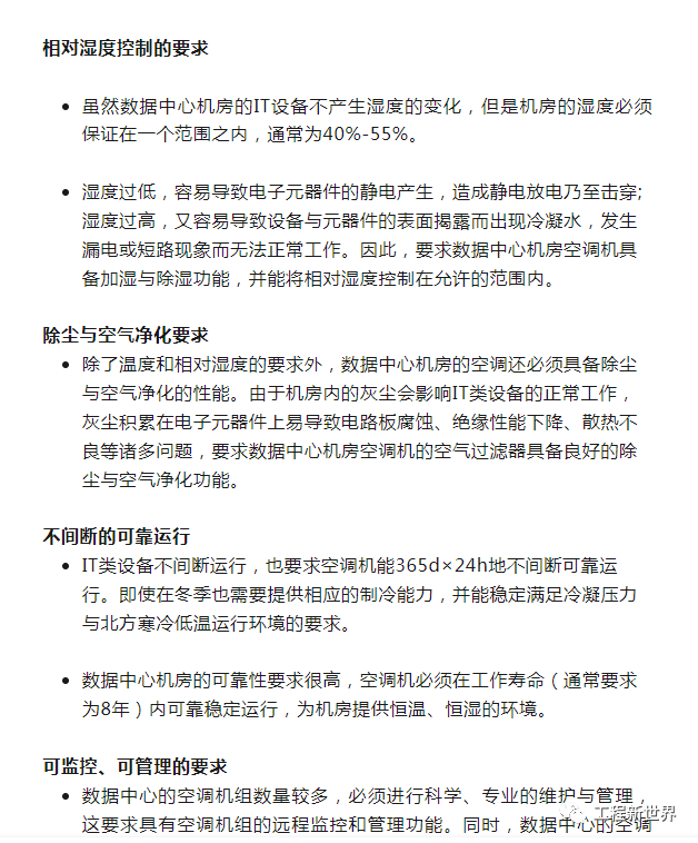 数据中心要求7*24*365天工作,要求相应的空调系统不间断运行,以保证数据通信设备运行的安全性和可靠性。