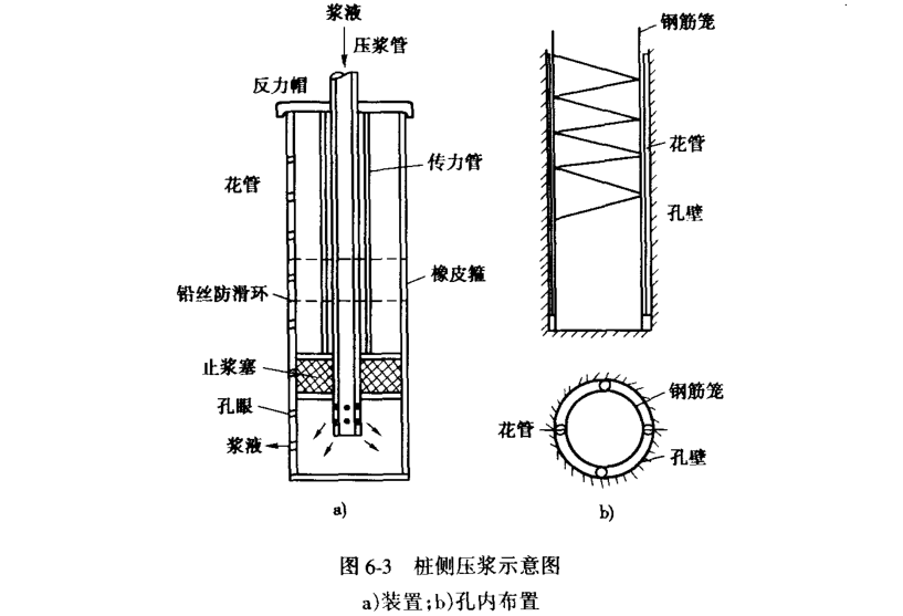 桩侧压浆如图6-3所示。桩侧压浆可以破坏和消除泥皮,充填桩侧的间隙,提高桩侧与周围土体间的粘结力,从而提高桩侧摩阻力。