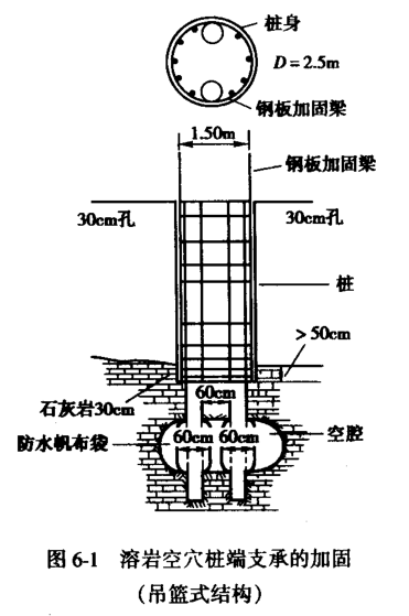 在遇到持力层中存在较大溶洞的情况时,对这类岩溶空穴地基的桩端支承加固,“吊篮式结构”方案如图6-1所示。其方法是在判断可能有岩溶空穴处,钻(或挖)孔并放入钢筋笼。桩的坡脚段长为600~800mm,然后放置入吊篮。吊篮上装接有两根直径300mm的管子,吊篮内装有粗砂砾,它的作用主要是灌浆成形和分配压力。接着浇注混凝土并抽去吊篮,再罩盖每个管子位置进行钻孔并至少达到岩溶空穴下面1.00m深处。再从钻孔底部到桩坡脚以上至少1.0m处放置一个带帆布模套的圈梁,接着灌浆和浇注混凝土,同时使空腔内的模套充气直至约为 直径600mm。模套起着围封的作用,以防止浆液漫流。